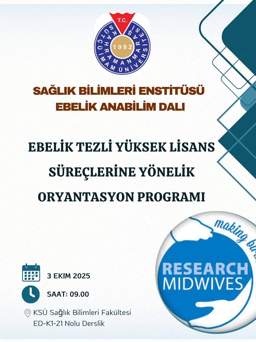 KSÜ Sağlık Bilimleri Enstitüsü Ebelik Anabilim Dalı tarafından, bu dönem aramıza yeni katılan Ebelik Tezli Yüksek Lisans öğrencilerimiz için “Yüksek Lisans Süreçlerine Yönelik Oryantasyon Programı” düzenlenecektir.Program 3 Ekim 2025 Cuma günü saat 09.00’da KSÜ Sağlık Bilimleri Fakültesi ED-K1-21 Nolu Derslikte gerçekleşecektir.